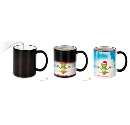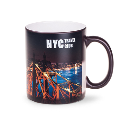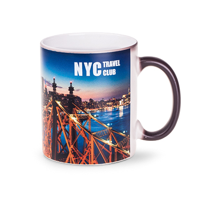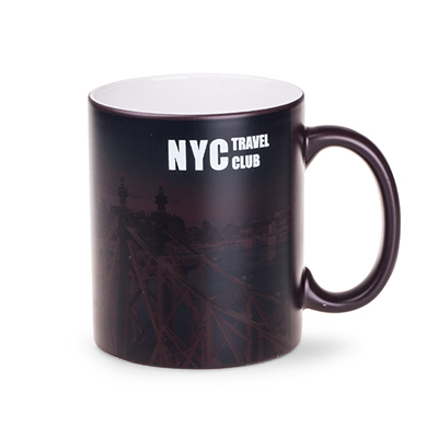 An advertising mug in a popular, cylindrical shape and matt surface. The model is dedicated to the application of the Magic Mug print - the designs only appear when warm. The matt external surface is serves to "hide" the print when the mug is cold.