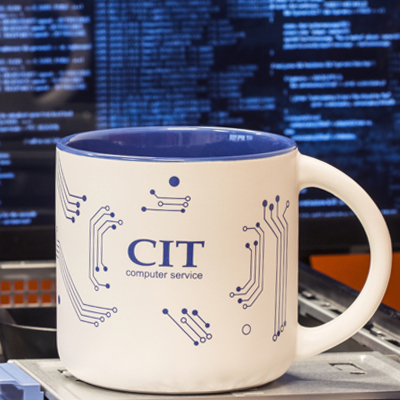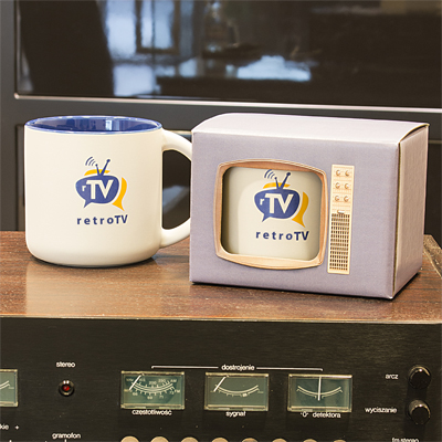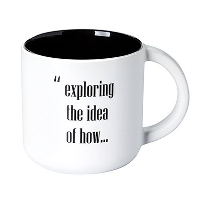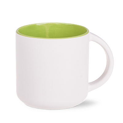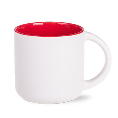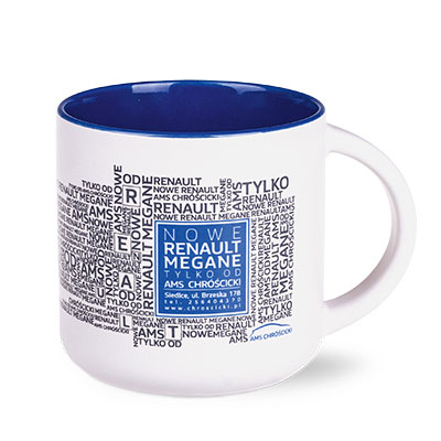 An advertising mug with the white, matt glaze on the outside and the colorful, glossy inside. Straight, cylindrical sides allow for the application of a large and complex advertising print. This design features a unique handle shape. The mug is very capacious.