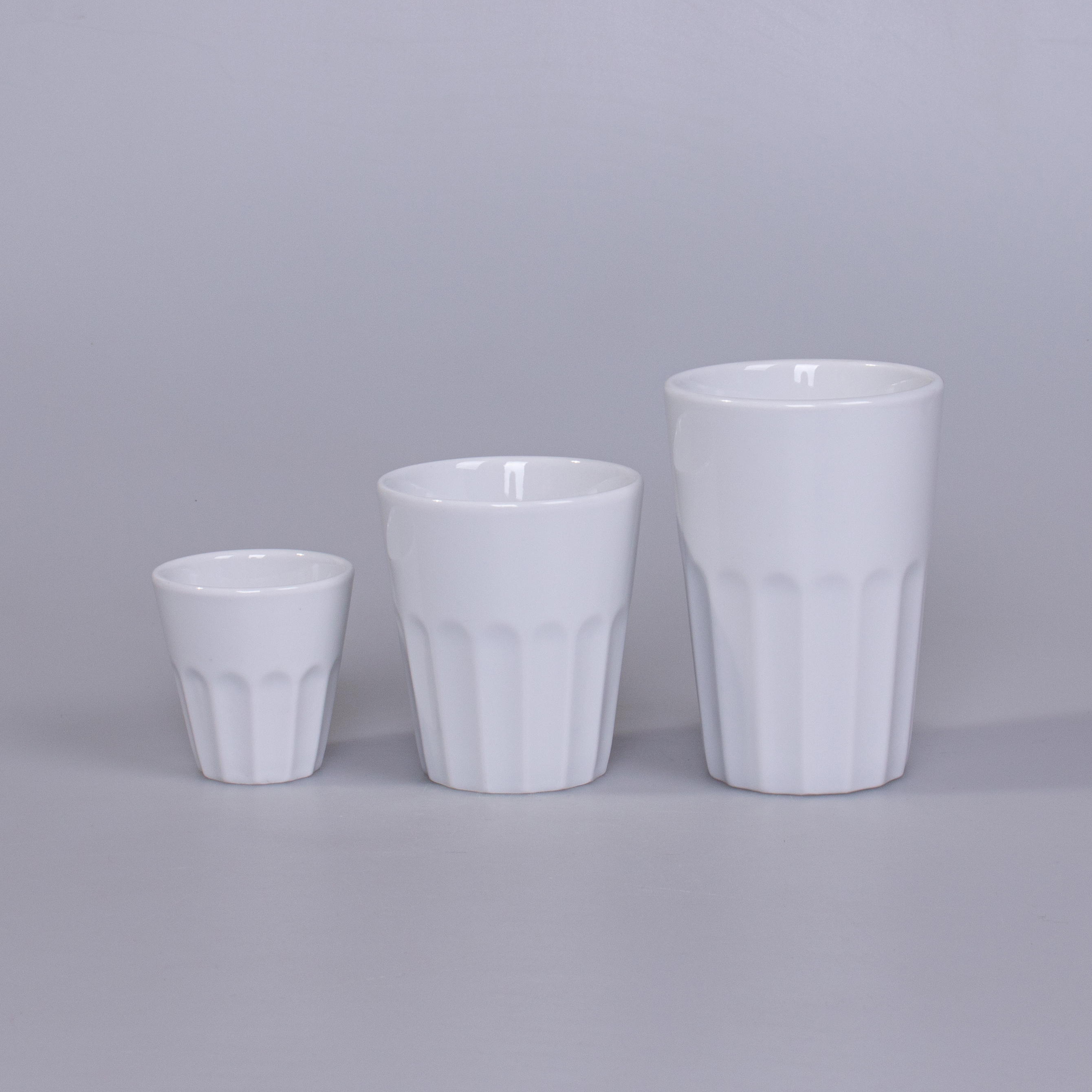A porcelain advertising mug without a handle, available in three sizes. The corrugated lower part allows for a sure grip. The design allows for stacking.