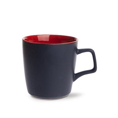 A mug from the BARREL family with a characteristic polygonal handle. Additionally, the Barrel Supreme mug is characterized by a colorful interior and a matte black surface on the outside.