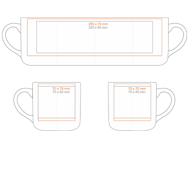Print on the handle (90x10 mm) Print on the inside (50x15 mm) Print on the bottom inside (ø55 mm) Print on the bottom outside (ø45 mm) Over the rim imprint Hand Made - rim painting Personal print |