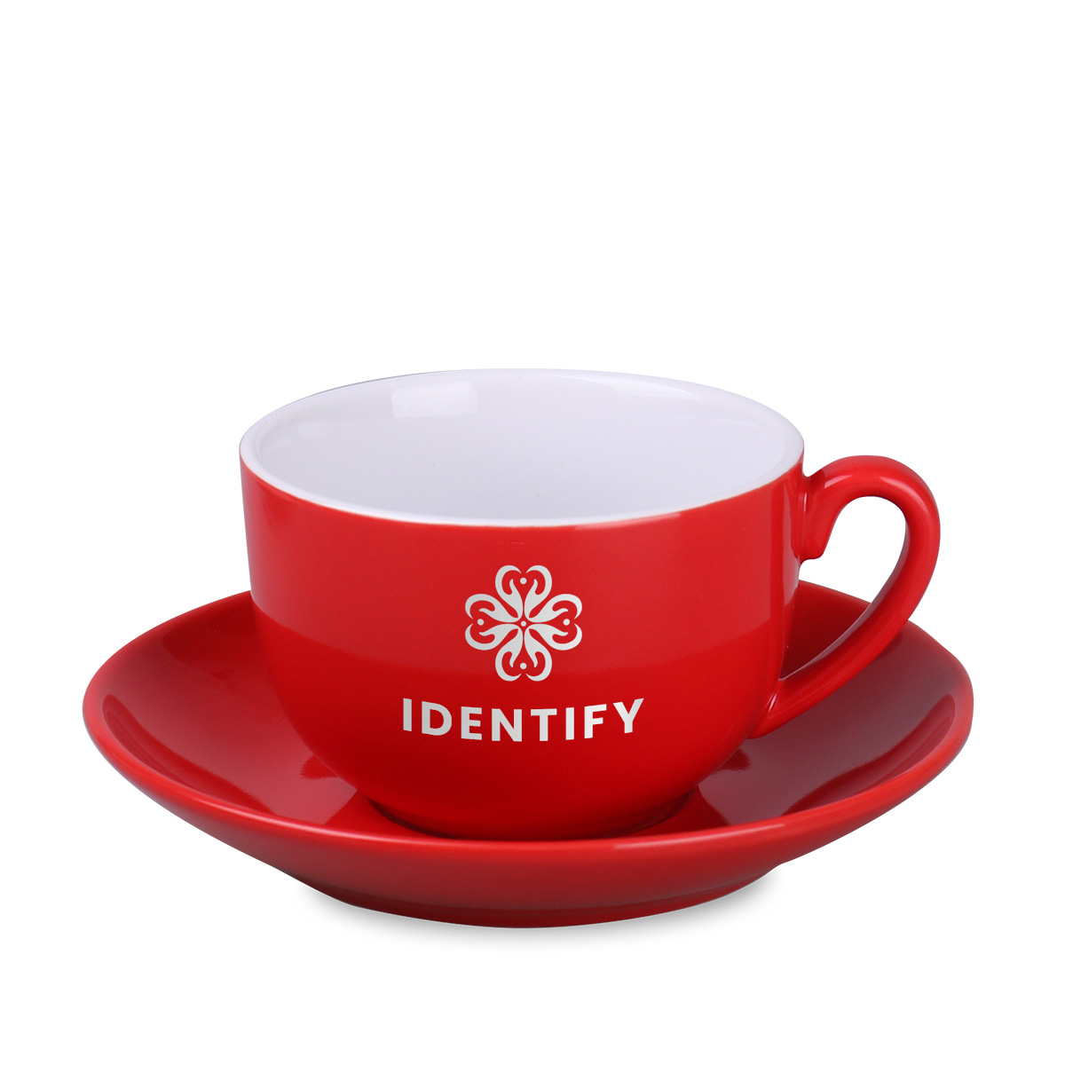 An oval shaped advertising cup with colorful outside glaze and white inside. The design is available in many different color versions.