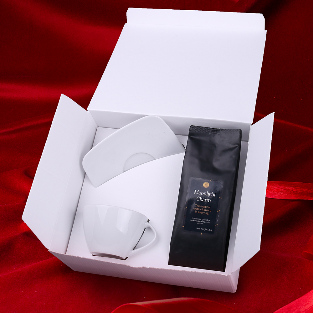 The elegant Luna Set porcelain cup paired with the aromatic green tea "Moonlight Charm" with jasmine – a blend that evokes special moments. The set is packed in dedicated eco-friendly Enlight packaging and finished with an elegant personalized band. THE PRESENTED DECORATION IS FOR ILLUSTRATION PURPOSES ONLY AND IS NOT INCLUDED IN THE PRODUCT PRICE. THE SET IS AVAILABLE IN DEDICATED ENLIGHT PACKAGING WITH A SELECTED DECORATION OPTION.