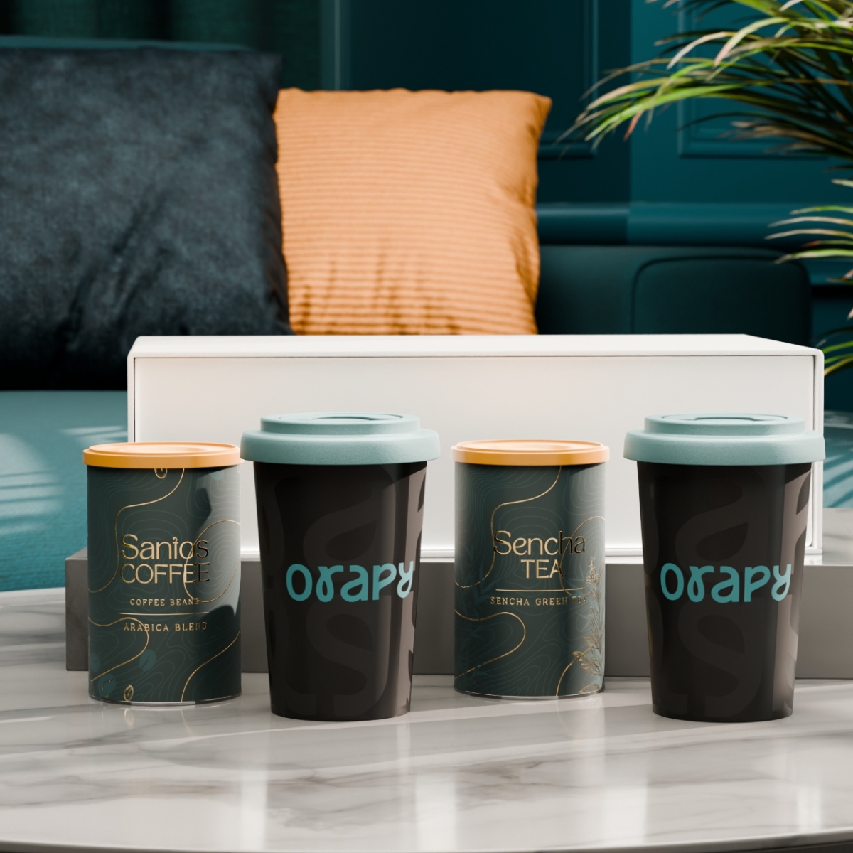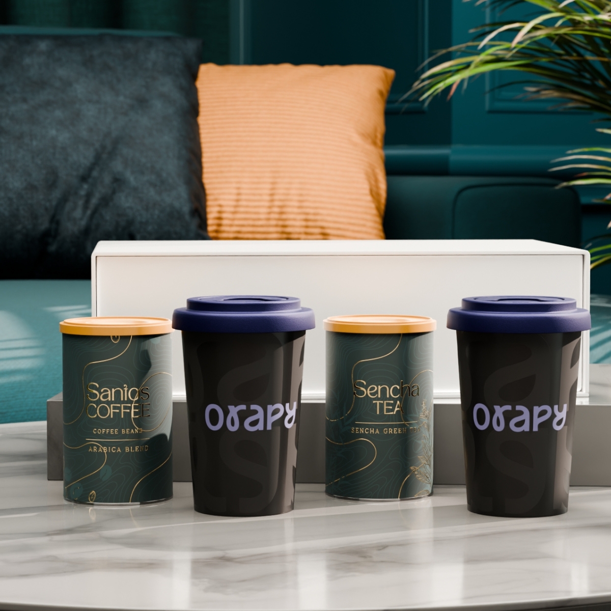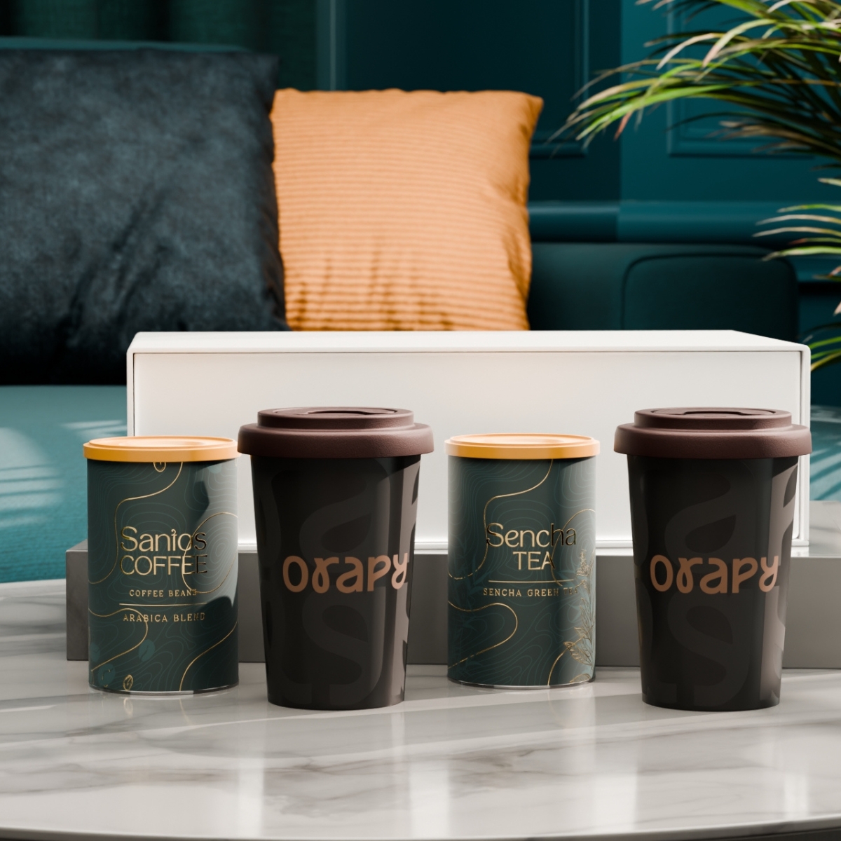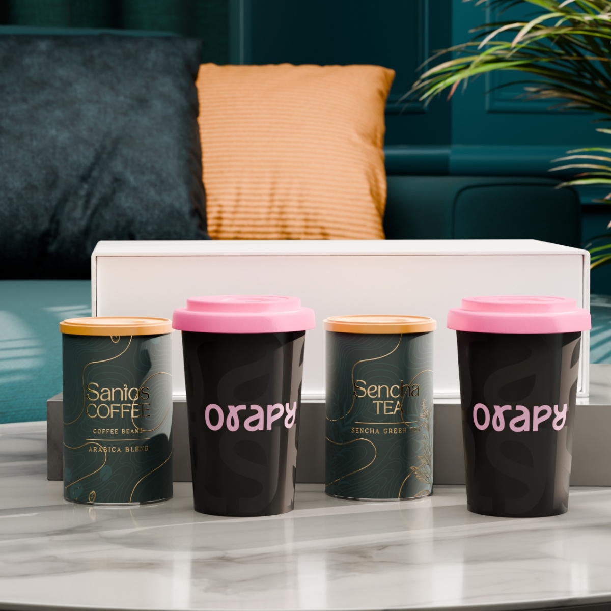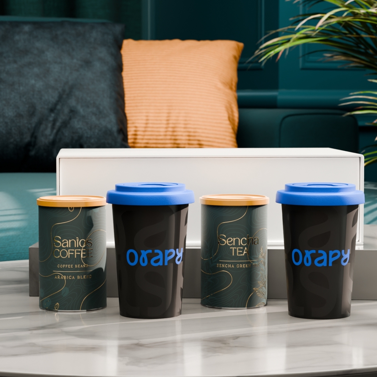 The set with Freedom mobile mugs combines mobility with subtle branding. Inside, it also includes selected “Santos Coffee” and “Sencha Tea” presented in elegant tins. The entire set is packaged in an exclusive, snow-white box with a magnetic closure. The lid is available in the following colors: white, orange 021C, Cool Gray 7, red 200C, navy blue 294C, brown 4695C, black, pink 4064C, blue 2144C, eucalyptus 5493C, desert sand 2310C.